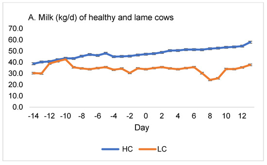 Milk productivity of HC increased linearly from 38.7 ± 0.15 kg to 57.90 ± 0.18 kg (p < y = 0.5504x + 39.869; R² = 0.9322, p < 0.001). From the ninth day before the diagnosis of laminitis until the end of the experiment, the milk production of the LC group of cows was statistically significantly lower compared to the group of healthy cows (p < 0.05); and only on the eighth day after the start of treatment did the milk yield of LC cows begin to increase slightly (Figure 2A).