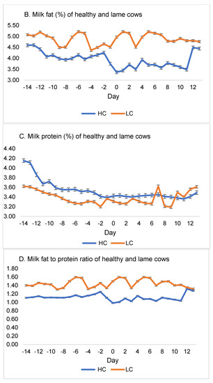 Our study shows that lame cows had a lower milk protein content and a higher milk fat-to-protein ratio. On the 3rd day before the onset of clinical signs of the disease until the day of diagnosis, the milk fat of lame cows was significantly reduced. In the milk of lame cows, lower concentrations of milk lactose were registered. Lameness in crossbred dairy cattle may affect the milk composition. Olechnowicz and Jacekowski (2010) detected a significant decrease in the average milk yield and in milk components of fat, protein, and lactose content in cows with clinical lameness, as compared to non-lame cows [35]; due to lameness, the cows exhibited poor absorption and assimilation of nutrients, since they were under more stress and pain and had increased oxidative agents, which in turn resulted in significantly lower average monthly protein, fat, and lactose contents and production compared to non-lame cows. In their subsequent trial, Olechnowicz and Jacekowski (2012) [36] observed that clinical lame cows had significantly lower milk protein content than healthy cows.