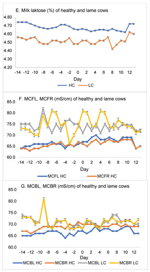 Changes in milk milk yield (A), fat (B), protein (C), fat to protein ratio (D), lactose (E), milk electrical conductivity of front left and right udder quarter (F), milk electrical conductivity of rear left and right udder quarter (G). MCFL—milk electrical conductivity of front left udder quarter; MCFR—milk electrical conductivity of front right udder quarter; MCBL—milk electrical conductivity of rear left udder quarter; MCBR—milk electrical conductivity of rear right udder quarter; HC—healthy cow group; LC—lame cow group.
