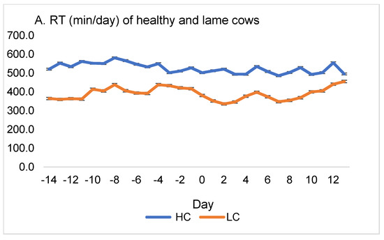 Change in rumination time (A), reticulorumen pH (B), activity (C), reticulorumen temperature (D), and body weight (E) of cows by group during the experiment. RT—rumination time; Activity—cow activity; TRR—reticulorumen temperature; BW—body weight; HC—healthy cow group; LC—lame cow group.
