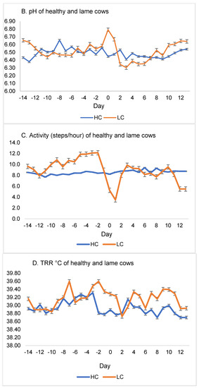 Lameness is an important health and welfare concern in dairy farming. Producers are aware of how painful this condition is to the animal. They are more than willing to put effort into controlling lameness, even if these control measures seem inconvenient; however, the prevalence of lameness in the herd remains underestimated [1]. Many cases go untreated for several weeks, and those that are treated often develop repeated cases, requiring further treatment [2]. In any herd, lameness has negative implications on productivity and behavior [3], and this may be heightened in farms where milking robots are used. In problematic herds with a high incidence of lameness, there is a huge economic loss due to the reduction in milk yield and weight loss [4,5,6]. Lame cows have lower milk yields, shorter rumination times, lower milk temperatures, and a lower intake of supplements, and exhibit greater refusal to go to milking [7]. These changes in milk composition can be used to determine lameness of infectious and non-infectious origins; this observation is supported by Bonfatti et al. (2020) [8]. Bramley et al. (2013) [9] found that herds that are at higher risk for lameness were also at much higher risk for acidosis. Acidosis systematically impacts the physiology of animals, including laminitis and a diffuse aseptic inflammation of the laminae [10,11]. Vasoactive substances (histamine and endotoxins) are released during a decline in ruminal pH and as the result of bacteriolysis and tissue degradation. These substances cause vasoconstriction and dilation, which ultimately destroy the microvasculature of the corium. The effects of rumen acidosis in fresh dairy cows are mainly manifested by decreased milk fat content, decreased fiber digestibility, and diarrhea [11]. AlZahal (2008) [12] also observed a decrease in pH below 5.6 and a rumen temperature exceeding 40 °C. According to AlZahal et al. (2008) [12], rumen temperature negatively correlates with rumen pH. Therefore, changes in rumen temperature can be used to determine acidosis, and this can potentially be achieved using radio-telemetric devices [13]. According to Zhang et al. (2015) [14], lameness also decreases milk yield and days in milk (DIM) as well as the milk fat and fat-to-protein ratio. Milk fat depression has been associated with a decreased acetate-to-propionate ratio [15]. Analyzing the fluctuations in the ratio of milk fat to protein and their relationship to the pH value of the rumen content, it was found that the ratio of milk fat to protein, showing sub-acute ruminal acidosis (SARA), is <1 [15]. Miekley et al. (2012) [16] investigated the use of milk electrical conductivity and cow activity for the early diagnosis of mastitis and laminitis. Lukas et al. (2009) [17] reported that the milk electrical conductivity is a reliable indicator of mastitis, but Khatun et al. (2019) [18] argue that the electrical conductivity of milk is not a very sensitive indicator for the detection of mastitis, even if is the most widely used method for the early diagnosis of mastitis recorded by automatic milking systems. However, Lukas et al. (2009) [17] described that other metabolic and digestive problems such as ketosis, left displaced abomasum, a retained placenta, and lameness were also associated with a clear increase in milk electrical conductivity. Walker et al. (2008) [19] observed that lame cows spend more time lying down, less time standing, and less time walking. Mazrier et al. (2006) [20] confirmed that the use of electronic devices to record walking time of cows can detect lameness 7–10 days before the onset of clinical signs, which is associated with decreased activity in cows. Cows with lameness have also been found to spend less time eating and to be less active compared with non-lame cows [21,22].