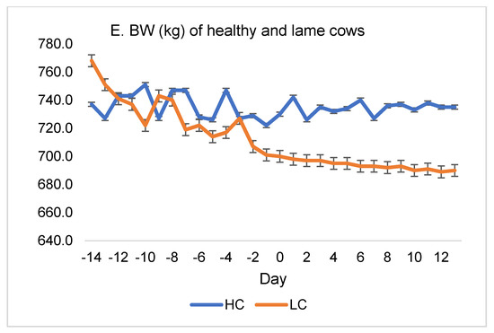 The activity of cows in the LC group decreased sharply from day “−2” to the first day after treatment, then increased, but began to decrease again at 10 days after the start of treatment. In HC this indicator changed less throughout the experiment (Figure 3C).