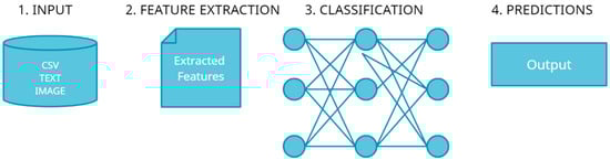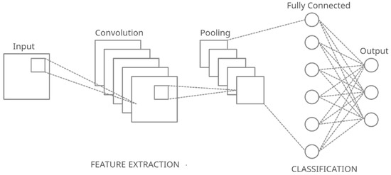 The primary advantage of using deep learning [9] techniques is to eliminate the need for feature extraction. Feature extraction is a complex process and requires a deep understanding of the problem in hand. Deep learning algorithms determine high-level features from data in an incremental manner. Figure 1 and Figure 2 reveal the steps associated with a deep learning problem. Deep learning combines the steps of feature extraction and classification. Another advantage of deep learning algorithms is their great potential to work with extensive data [10]. Pardede, Hilman F. et al. [11] used a convolutional autoencoder to counter the problem of hand-crafted features. The autoencoder extracted features via unsupervised learning techniques. The outputs of the autoencoder are later fed to an SVM-based classifier for the purpose of feature learning. The advancements in the domain of computer vision and deep learning have led to the use of convolutional neural networks [12] (CNNs). CNNs have become the go-to models for image classification tasks. The most significant advantage is its architecture and how it extracts and passes features to the subsequent layers. A CNN consists of broadly two modules—the feature extraction module and the classifier module. The role of the feature extraction module is to draw out the relevant features from the image via convolution and pooling. The classifier module acts upon the extracted features and performs the task of output predictions. Figure 3 shows a simplified structure of convolutional neural networks.