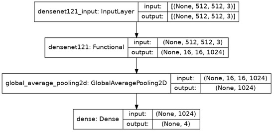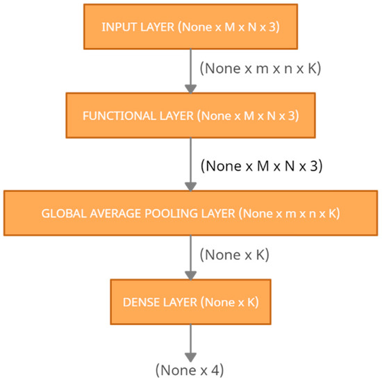 As it can be seen, the input layer assumes an image of size M × N × 3. In our case, the images are trimmed to the dimensions (512 × 512 × 3) before feeding it to the base pre-trained model. The functional layer represents the pre-trained model. These models are already trained using some other datasets, and we make use of their weights via transfer learning. The output of the functional layer is then fed to a Global Average Pooling layer [45]. The idea of introducing this layer is to reduce the size of the feature map to a 1D vector by averaging the values present in the pool (in our case, each m × n 2D vector). This layer outputs a one-dimensional vector which is fed to a fully connected dense layer. This final layer reduces the size to 4 classification categories and applies the SoftMax activation [46]. SoftMax function consumes a one-dimensional vector of Z values and outputs its normalized form, which consists of Z probabilities, each representing the probability of the classification falling in one of the Z classes. In our case, the value of Z is 4. The sum of all the probabilities equals 1 and the value of the SoftMax score lies between [0, 1] (0 and 1 inclusive). The target class with the highest probability is termed as the output of the whole classifier. Our models make use of the Adam Optimizer [47]. Adam optimization is an algorithm that iteratively updates network weights epoch by epoch. When compared to its counter algorithms, it is more effective and faster. During the training of the models, we kept the number of epochs to be 20 and the batch size per epoch as 128.