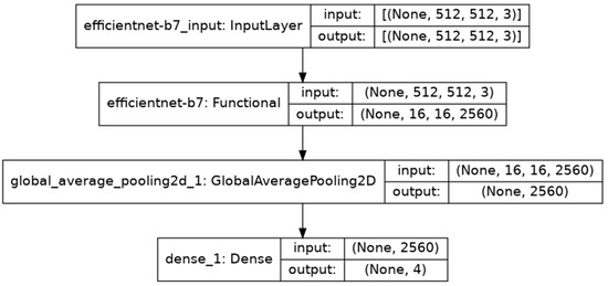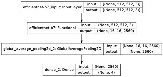 For our research, we used the EfficientB7 model pre-trained on the ImageNet dataset. Figure 21 represents the structure of our model that includes the pre-trained EfficientNetB7 model.