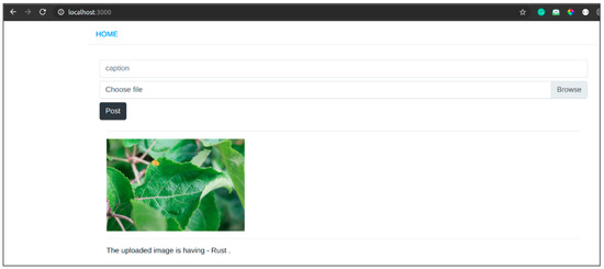 To use our system, the user has to visit our web application and upload the image of the apple leaf for which he wants to check the class. On clicking the upload button, the image is sent to the backend, where it is fed to our model, and the result is showed to the user. Figure 26 shows the snapshot of our web application which depicts the above-foresaid process. The entire code of our web application is available at https://github.com/prakhar070/apple-disease-detection (accessed on 20 April 2021) [56].