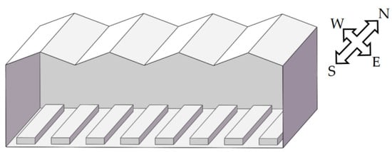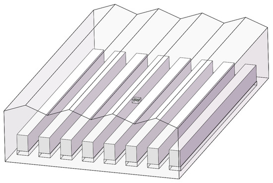 where S is the momentum loss term; μ is the dynamic viscosity, N·s/m2; α is permeability, 0.395 m2 [17]; ρ is fluid density, 1.225 kg/m3; and C2 is the inertia loss coefficient, 0.4 [17]. According to a Venlo greenhouse, a three-dimensional model was established. Its parameters are shown in Table 2. The established greenhouse model is shown in Figure 2. The diagram simplifies the structure of air exchange inside and outside the greenhouse and only depicts its geometric structure.