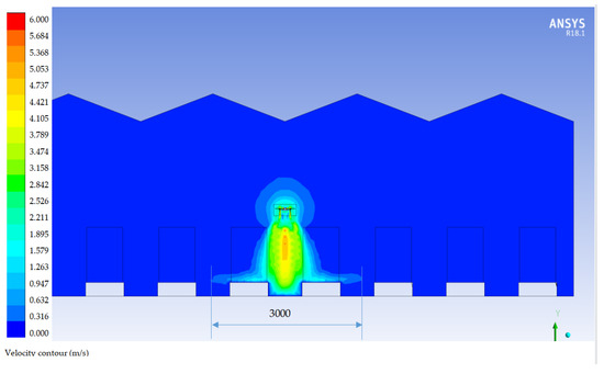 The UAV was limited by the height of the greenhouse, and so the flight height was generally less than 3 m. There was an obvious ground effect, and a near-surface regional flow field developed on the wall on both the north and south sides of the greenhouse. Occluded by the cultivation trough, the flow field extended 1.5 m in the east–west direction (Y-Z plan)and then decreased to 0 m/s, and the development area was far less than the north–south (X–Y plane) flow field, as shown in Figure 9. The cultivation tank was the main factor restricting the development of the UAV flow field.