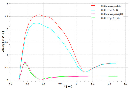 In this study, a greenhouse with tomatoes was used to obtain the wind speed on both sides of the tomato crop near the UAV. The results are shown in Figure 8. The two velocity curves of the crops on the far side of the UAV were approximately coincident, and the maximum velocity difference was 0.07 m/s. By contrast, the wind velocity curves of the crops near the UAV were quite different, particularly in the range of 0.35–1.1 m away from the ground, where the two curves were obviously not coincident. In the vicinity of the crops, the flow field near the UAV side was not fully developed, and the wind speed was slightly lower. The maximum velocity difference between the two was 0.36 m/s. In general, tomato plants have a small leaf area and low leaf density, which have no obvious effect on airflow blocking.