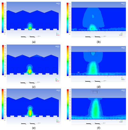 Figure 10. Velocity contour; (a) Y = 1.1 m X–Y; (b) Y = 1.1 m crop section; (c) Y = 1.5 m X–Y; (d) Y = 1.5 m crop section; (e) Y = 1.9 m X–Y; (f) Y = 1.9 m crop section.
