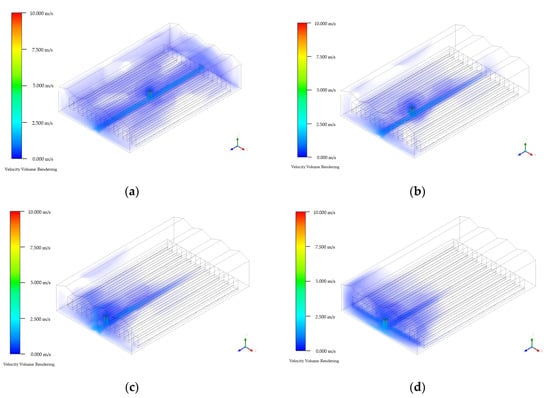 According to the 3D velocity volume data, all the velocity volume details were displayed on the 2D image at the same time, which was called velocity volume rendering. The velocity volume rendering was used to display the comprehensive distribution of the airflow field in the two-dimensional image, and through the control of the opacity, the situation of the velocity isosurface was reflected. Figure 11 shows a speed volume rendering of four locations in the middle of the row, in the quarter of the row, at the end of the row, and in the aisle. It can be seen that the flow field mainly developed between the rows when the UAV hovered. When the UAV hover position gradually moved to the northern side of the greenhouse, the symmetry of the flow field distribution in the greenhouse disappeared, and the wind speed in the northern side of the greenhouse increased, resulting in a larger wind speed on the side of the UAV flight altitude, which affected the flight state of the UAV and caused a decrease in flight stability.