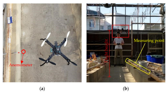 Figure 12. Greenhouse test. (a) Anemometer and UAV; (b) UAV flight in greenhouse.