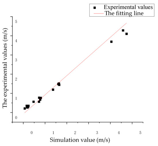 Linear regression analysis was performed on the experimental and simulated values (Figure 13). The regression fitting equation was y = x − 0.08139, the R2 was 0.97486, and the significance level was 0.05. In summary, the numerical simulation results of the UAV greenhouse airflow field were accurate.