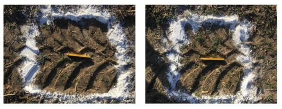 Application with the tractor–slurry tanker combination was conducted on 3 and 4 April 2018. The tire print of each tire of the tractor and slurry tanker was measured photometrically (Figure 1) according to Diserens et al. []. The average soil moisture content (0–30 cm) was 31.5% in the field with a cover crop and 28.4% in the field without a cover crop. The tractor slurry tanker combination was about 12 m in length and weighed 16,470 kg (empty), 25,940 kg (half-filled), and 34,620 kg (fully filled). The slurry tanker (Zunhammer SKE18500 PU, Germany) with tandem axles was equipped with a 15 m range drag shoe dispenser for slurry application and a single tube tire inflation pressure control system. The slurry tanker volume was 16,500 L. The tire inflation pressure of the tractor was constantly at 150 kPa in all four wheels, whereas for the slurry tanker tires, the inflation pressure was set at 300 kPa (high) and at 100 kPa (low), depending on the setting. The passing speed was set constant with 5.6 km h−1.