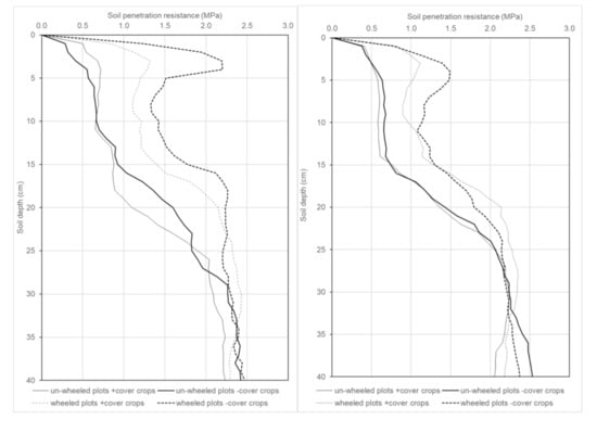 A peak of the cone penetration could be seen in the depth 0–5 cm in the wheeled plots (Figure 2). A plough pan was not observed, indicating that there were no soil compaction formations left, which had been caused by the former in-furrow moldboard ploughing. Five years ago, the tillage system shifted from ploughing to reduced tillage.