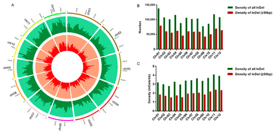 Identification and distribution of InDels in the 3000 Rice Genome Dataset. (A) The frequency and relative distribution of InDels physically mapped on 12 chromosomes of Nipponbare genome are illustrated by a circos circular ideogram. The outermost circles signify the different physical size (Mb) of 12 chromosomes, the middle circles represent the number of all InDels per 1 Mb and the distribution on the chromosome, and the inner circles represent the number of 50–1000-bp long InDel per 1 Mb and its distribution on the chromosome. (B) The number of all InDels and >50-bp long InDels in various genomic chromosomes. Green represents the number of all InDels and red represents the number of >50-bp long InDels. (C) The density of all InDels and >50-bp long InDels in 12 chromosomes. Green represents the density of all InDels and red represents the density of >50-bp long InDels.