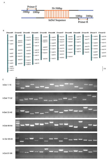 To facilitate detection by agarose gel electrophoresis, we selected 50–900-bp long InDels and designed the primers at the position 100–200 bp upstream and downstream (Figure 2A). According to the average distribution on chromosomes, we randomly designed 96 primers of approximately 3.98 Mb/InDel (Figure 2B, Table S3).