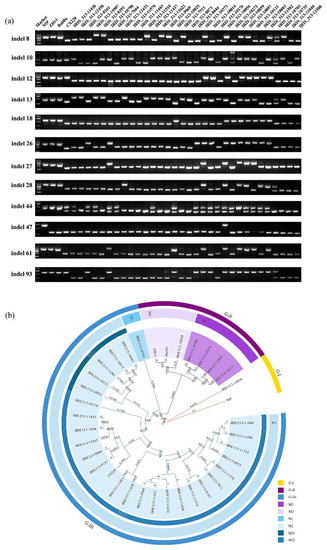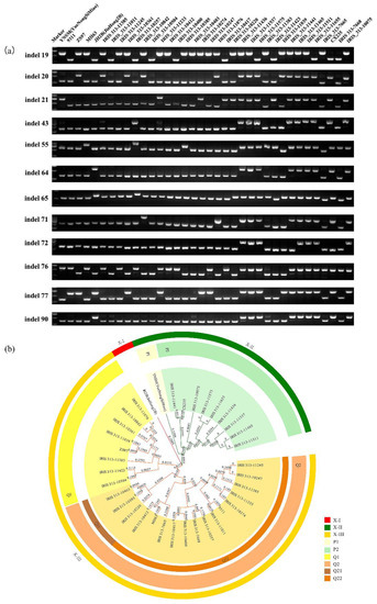 Phylogenetic analysis showed that these 36 rice accessions were clearly classified into three groups, designated as XI-I, XI-II, and XI-III (Figure 4b). According to the polymorphism of InDel markers, XI-II was divided into two subtypes: P1 and P2. The P2 sub-type included nine varieties: IRIS_313-11441, CX235, IRIS_313-10075, IRIS_313-11575, IRIS_313-11655, IRIS_313-11436, IRIS_313-11537, IRIS_313-11465, and IRIS_313-11511 (Figure 4b). IRIS_313-11441, CX235, IRIS_313-11537, IRIS_313-1145, and IRIS_313-11511 were from the Philippines (Figure 4b, Table S1). Therefore, our InDel markers maintained rich polymorphisms in indica rice and could group different cultivars based on their geographical relationship. When the similarity value was only 0.0357, XI-III could be separated into two categories: Q1 and Q2 (Figure 4b). In the Q1 sub-type, IRIS_313-11039, IRIS_313-10504, and ZS97 could be grouped together owing to their close geographical relatedness (Table S1). Q2 could be further divided into two types: Q21 and Q22 (Figure 4b). In Q22, the remaining 13 varieties had polymorphism changes and could continue to differentiate into two major types: Q221 and Q222 (Figure 4a,b). In Q222, IRIS313-10417, IRIS313-7668, IRIS313-11011, IRIS313-11233, and IRIS313-10385 were from Southeast Asia, which showed that these InDel markers can identify and screen diverse varieties with certain geographical affinities.