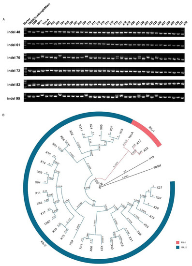 The InDel molecular markers can be used to determine the characteristics of indica and japonica, and this is convenient for breeders to avoid similarities in selecting varieties [44]. We selected a series of RILs derived from the cross between 9311 and YouA for polymorphism analysis. The results indicated that the progeny of RILs can be divided into two types according to the parents 9311 and YouA, and this result can be used to understand which parent it comes from (Figure 5). Interestingly, as we found that the X-10 is in the outer group, we speculate that the previous generation of parents may not be critically self-pollinated, but pollinated with other varieties. It also confirmed that our indel markers can help us to identify the homozygosity of offspring and provide a reliable way to construct novel materials (Figure 5B). When using markers to analyse the polymorphism of the selected varieties, we found heterozygous bands in multiple varieties (Figure 3a, Figure 4a and Figure 5A). These results mean that the varieties were not homozygous, which were still needed to self-cross and selection by molecular markers. Through the development of the above InDel markers, the homozygosity of a variety can be identified, which will be beneficial in experiments.