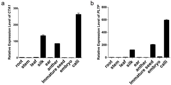 Gene expression level of ZmCTA1 and ZmPLTP in various maize tissues. (a,b) RT-qPCR confirmed the expression level of ZmCTA1 and ZmPLTP in the root, stem, leaf, silk, ear, anther, immature seed, embryo and calli of maize. Actin was used as an internal control. Date are the mean values with standard error of mean (SEM), n = 3 individuals.