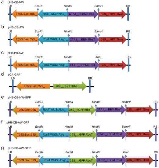 We also constructed linkage pHB vectors expressing ZmBBM, ZmWUS, and GFP as the pHB-CB-NW-GFP vector (ZmCTA1pro::BBM-NOSpro::WUS-35Spro::GFP) (Figure 2e), the pHB-CB-AW-GFP vector (ZmCTA1pro::BBM-Axig1pro::WUS-35Spro::GFP) (Figure 2f), and the pHB-PB-AW-GFP vector (ZmPLTPpro::BBM-Axig1pro::WUS-35Spro::GFP) (Figure 2g). These pHB-related vectors contain the Hygromycin phosphotransferase gene (HPT) [34] as the selectable marker gene of positive transgenic plants.