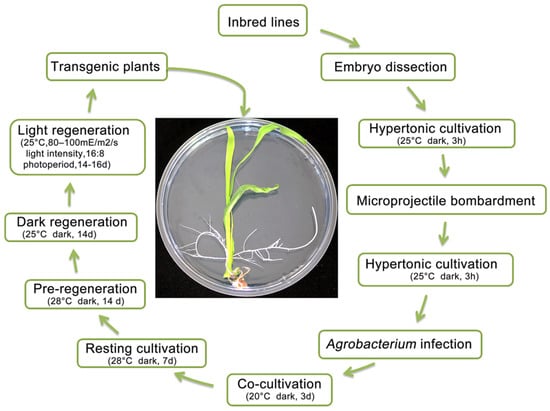 Immature embryos of Zheng58, Mo17, Chang7-2, and B73 inbred lines were placed at 4 °C overnight before transformation. After dissecting immature embryos, the embryos were transferred to hypertonic medium and cultured at 25 °C for 3 h. After the immature embryos were bombarded with the microprojectile bombardment technology, the embryos were cultured in hypertonic cultivation medium at 25 °C for 3 h. The immature embryos were transferred to IM medium and washed twice with 1 mL fresh IM medium. One milliliter of Agrobacterium tumefaciens liquid-infected immature embryos was mixed well in the dark for 5 min. The young embryos were transferred to cultivation medium to remove the excess bacterial liquid, their scutellas were kept upright, they were blown dry for 38 min in the super clean platform, and they were sealed into plates and cultured in the dark at 19 °C for 3 days. The immature embryos on cultivation medium were transferred to resting cultivation medium in the dark at 28 °C for 7 days. When calli formation occurred, the calli were transferred to pre-regeneration cultivation medium and cultured in the dark at 25 °C for 14 days. The calli were transferred from pre-regeneration cultivation medium to dark regeneration cultivation medium and later sealed with breathable film at 25 °C. The somatic embryos were transferred to light regeneration medium, sealed with light regeneration, and placed in a light incubator (25 °C, light intensity 80–100 me/m2/s, photoperiod 16:8). After somatic embryos grew into 3–5-cm seedlings, these embryos were placed in a light incubator with double distilled water.