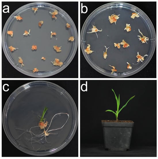 For the entire process of transformation culture, the transformation cycle for obtaining positive transgenic seedlings required approximately 52–66 days (Figure 3). In particular, we observed that the recalcitrant Zheng58 inbred line successfully produced transgenic plants after treatment with the bivector genetic transformation system, with the shortest period being 52 days, 38 days less than that required by traditional transformation [35]. Embryos were dissected from the seeds 14–16 days after self-pollination (DAP) of inbred lines. The length of immature embryos was 1.8–2.2 cm. After 3h in hypertonic cultivation medium, the pHB-CB-NW vector was transformed into immature embryos using microprojectile bombardment technology. After 3 h in hypertonic cultivation medium, the pCA-GFP vector was integrated into the maize genome via Agrobacterium infection. Transgenic embryo culture was undertaken in cocultivation medium for 3 days, resting cultivation medium for 7 days, no screening cultivation medium for 12 days (not a necessary step), pre-regeneration cultivation medium for 14 days (Figure 4a), dark regeneration cultivation medium for 14 days (Figure 4b), and light regeneration cultivation medium for 14–16 days (Figure 4c), and transgenic plants were grown in the experimental field (Figure 4d).