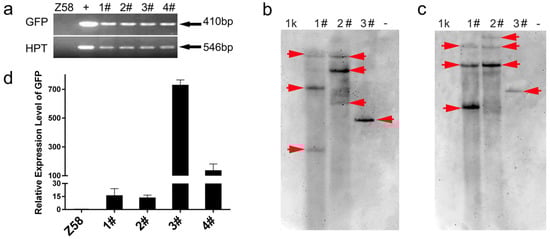 The transgenic Zheng58 plants carried the bivector system, including the induction vector (ZmCTA1pro::BBM-NOSpro::WUS) and the indicator vector (35Spro::GFP), exhibiting the highest transformation ratio. We identified the integration and expression of GFP in these positive transgenic lines of Zheng58. Via PCR, we detected the GFP gene by amplifying a 410-bp band with specific primers targeting GFP, and we detected ZmCTA1pro::BBM-NOSpro::WUS by amplifying a 546-bp band with specific primers targeting HPT (Table S2). By PCR identification, we detected both GFP and ZmCTA1pro::BBM-NOSpro::WUS in the 1#, 2#, 3#, and 4# transgenic lines (Figure 5a). Via Southern blot analysis, we detected the integrated copies of the GFP gene. The gel blot was probed with the DIG-labeled GFP cDNA fragment without the restriction enzyme sites of HindIII and EcoRI. By digesting the genome of the 1#, 2#, and 3# transgenic lines with HindIII (Figure 5b) and EcoRI (Figure 5c), the copy number of GFP was three, three, and one, respectively. RT-qPCR analysis showed that the GFP gene expressed in the 1#, 2#, 3#, and 4# transgenic lines (Figure 5d).