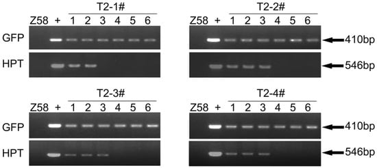 For the progeny seeds of lines 1#, 2#, 3#, and 4# of transgenic Zheng58 (T2-1#, T2-2#, T2-3# and T2-4#), we detected the target gene GFP by amplifying a 410-bp band with primers specific for GFP, and we detected ZmCTA1pro::BBM-NOSpro::WUS by amplifying a 546-bp band with specific primers targeting HPT (Figure 6, Table S2). The results showed that we obtained separated progenies only with the presence of GFP but not with ZmCTA1pro::BBM-NOSpro::WUS. In T2-1#, T2-2#, T2-3#, T2-4#, the numbers of segregated seeds were four, three, three, and three, respectively. Further, statistical analysis showed that the segregation ratio [(number of separated seeds ÷ number of T2 seeds) × 100] was in the range of 2.03 to 6.78% (Table 2).