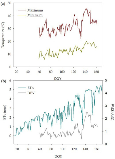 Climatic conditions in the greenhouse. (a): Maximum (brown) and minimum (yellow) temperature; (b): Evapotranspiration (ETo) (blue) and vapor pressure deficit (VPD) (grey).