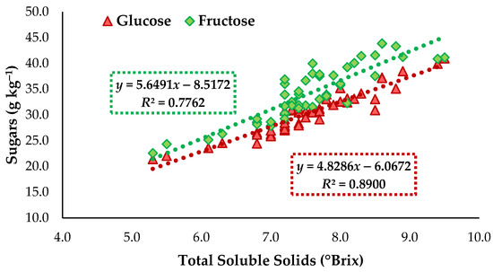 Quadratic correlation between: Sugars (glucose and fructose) and total soluble solids (TSS). Four repetitions per treatment were used for the correlation.
