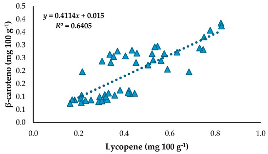 A clear relationship was found for the contents of lycopene and β-carotene (R2 = 0.64, p < 0.001), demonstrating a similar accumulation pattern of these two carotenoids in tomatoes (Figure 3).