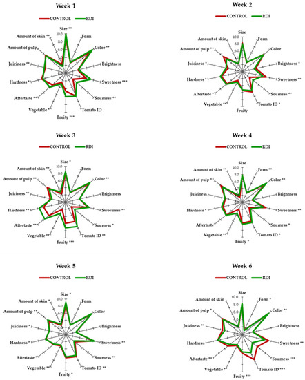 In general, the sensory profiles of RDI tomatoes at weeks 1–3, were characterized by higher intensity of key attributes, such as sweetness, sourness, fruit and green notes, aftertaste, and hardness (Figure 4). On the other hand, this trend was reversed at week 6, where control fruits presented a more intense tomato flavor (higher intensity of sweetness, sourness, and tomato-ID) than RDI fruits, probably at this week the stress suffered by RDI plants was extremely strong and plants were highly affected. In this way, the proposed deficit irrigation treatment led to tastier cherry tomatoes from 1 to 5 weeks of water deficit. Pérez-Marín et al. [12] also reported that the most characteristic descriptors were sweetness, fruity, hardness, in a study carried out for samples of cherry tomatoes (pear and round) of different varieties.