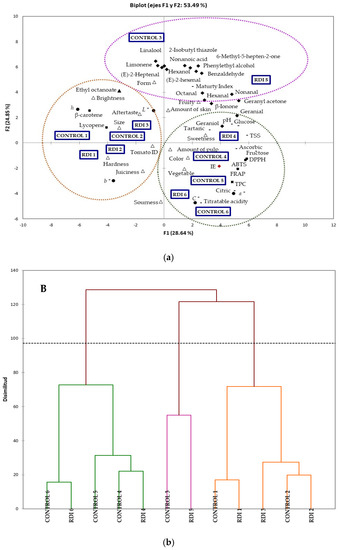 The PCA analysis is by far the most used technique for dimensionality reductions, meant to reduce the number of variables while preserving as much information as possible, and provide an accurate and simple view of total results. In this case, PCA basically showed that the “harvesting time” was more relevant than the factor “irrigation treatment”. In this way, all samples (both control and RDI treated) from weeks 1 and 2 were grouped together and characterized by high contents of lycopene, β-carotene, high size, intense hardness, juiciness, tomato-ID, and long aftertaste. On the other hand, all samples collected at weeks 4–6, independently of the RDI treatment, were characterized by high values of TPC, antioxidant activity (ABTS•+, DPPH•, and FRAP), high contents of both sugars (also TSS) and organic acids (also titratable acidity) leading to red, sweet, and sour fruits with a high content of pulp. However, it can be seen that RDI tomatoes were mainly surrounded by tomato ID, hardness, juiciness, sweetness and redder color.