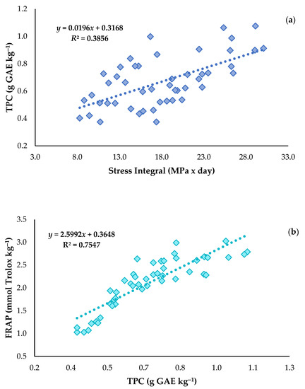 Figure 6 seems to establish relationships among the stress integral (SI) and TPC (a) as well as between TPC and the FRAP values (b). In this way, the higher the stress integral (more intense the water stress), the higher the accumulation of phenolic compounds (higher values of TPC), leading to higher antioxidant activity as showed by the FRAP values. This general trend is supported by the following Pearson’s correlation coefficients and significance (Table 6): (i) SI vs. TPC, R = 0.60, p < 0.001; and (ii) TPC vs. FRAP, R = 0.87, p < 0.001.
