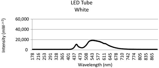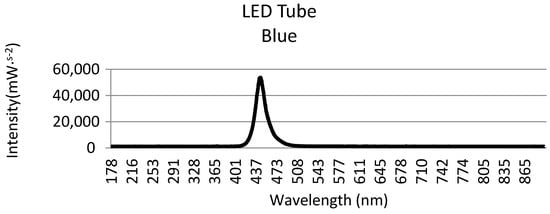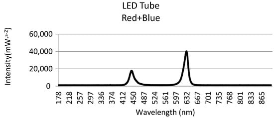 The air temperature in the growth room was maintained at 20 °C, and the relative humidity was 65–70%. The light spectrum characteristics measured with a spectroradiometer (USB 4000, Ocean Optics Inc., Dunedin, FL, USA) is shown in Figure 2, Figure 3, Figure 4 and Figure 5.
