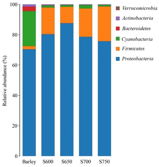 Bacterial community found in fresh barley and silages at the phylum level (n = 3). S600, S650, S700, and S750 represent silages densities of 600, 650, 700, and 750 kg/m3, respectively.