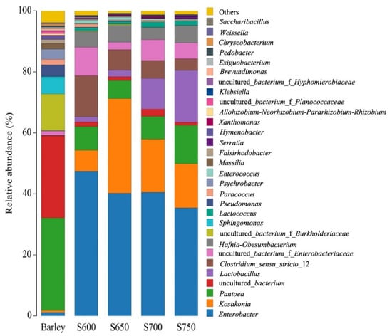 The bacterial composition in the fresh barley and silages at genus levels is displayed in Figure 2. In the fresh barley, the dominant bacterial genera were Pantoea (30.4%), followed by uncultured bacterium (26.9%), and uncultured bacterium_f_Burkholde (12.0%). However, Lactobacillus was almost undetectable in fresh barley (<1%). After fermentation, the genus Enterobacter predominated in all silages. As silo density increased, the relative abundance of Enterobacter decreased from 47.4% to 35.4% and that of Clostridium decreased from 13.5% to 3.8%. In contrast, Lactobacillus abundance increased to 17.0% in the S750 silage as compared with 1.8% in S600 silage. Kosakonia and Pantoea were found in high abundance (6.9–31.0% and 6.0–12.6%, respectively) in all silages. Uncultured bacterium from Enterobacteriaceae was found in S600, S700, and S750 silages, and the corresponding abundance was 9.3%, 6.7%, and 5.2%. Hafnia-Obesumbacterium was found only in S650 and S750 silages, and the corresponding abundance was 5.5% and 5.6%.