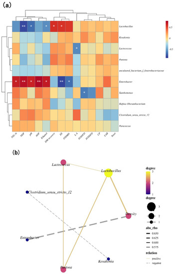 (a) Correlation clustering and heat map analysis of top 10 genera with pH, LA, ethanol, NH3-N, LAB, yeast, CP, NDF, ADF, EE, DM recovery, IVDMD, IVNDFD, and IVADFD; (b) correlation network among main bacterial genera (top 10) and density (b) (n = 12). The values presented by colors in the heat map correspond to the Pearson correlation coefficient r, which ranged between −0.5 and 0.5, where r < 0 indicates a negative correlation (blue), r > 0 indicates a positive correlation (red), ‘*’ represents p < 0.05, and ‘**’ represents p < 0.01. In (b), absolute value of correlation coefficient > 0.5 and p-value < 0.05.