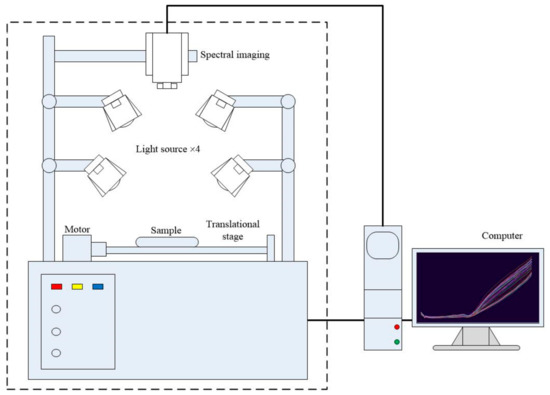 The hyperspectral data of the Tibetan tea test is acquired using a GaiaSorter hyperspectral sorter made by Beijing Zolix Company, which provides an effective spectral band of 387–1035 nm, a spectral resolution of 2.8 nm and 256 spectral channels. We spread the tea leaves evenly into a square in a container (about 65 cm × 65 cm). The hyperspectral acquisition system is shown in Figure 1. Due to the influence of dark currents at the beginning and end of the spectral band, only the 420–1010 nm band is retained as raw spectral data. The sample platform is set to move at a speed of 4.0 , the distance of the imaging object is 170 mm, and the camera exposure time was set to 16 ms. We placed the tea to be tested on the stage. Under the illumination of a uniform light source, the platform is moved horizontally at a set speed, and the hyperspectral camera can obtain continuous hyperspectral images of the samples on the platform. The acquired images are then calibrated using Equation (2):
