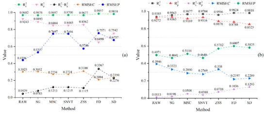 The modeling results established based on hyperspectral technology are affected by many factors. The method of feature data preprocessing is a major factor affecting the results. Common spectral data preprocessing methods include orthogonal signal correction (OSC) [20], first derivative (FD) [21,22], second derivative (SD) [22], multivariate scattering correction (MSC) [21,22,23], standard normal variable transformation (SNVT) [21,22,23], Savitzky–Golay filter (SG) [21,24]. It was shown that these methods could reduce the influence of external factors and improve detection accuracy to some extent.