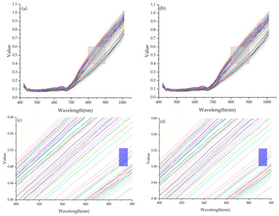 Tibetan tea spectrum curve. (a) Raw data; (b) Data preprocessed by SG algorithm; (c) Enlarged view of the red frame in Figure (a); (d) Enlarged view of the red frame in Figure (b).