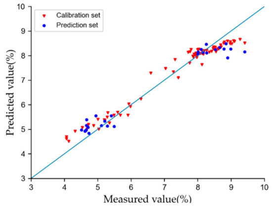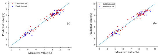 where and are the measured value and predicted value of the sample, respectively, represents the average value of the sample and n is the number of samples. When the predicted value () of the model is closer to the true value (), the better the effect, in other words, a good model should have small RMSE values (the closer the value of RMSE is to 0, the better the effect of the model). Furthermore, the models with high values are better than the models with low values (the closer the value of is to 1, the better the effect of the model). At the same time, the smaller the difference in the determination coefficient between the calibration set and the independent test set of the model, the better. If the gap is too large, it indicates that the model is under-fitting or over-fitting.