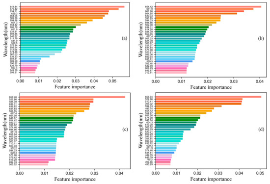 The selection of spectral characteristic bands is another important factor affecting the model results. Effective selection of characteristic bands can save computing resources [25] and improve model performance. In recent years, researchers have proposed many characteristic band selection methods, such as interval partial least squares (iPLS) [26,27], synergy interval partial least square (siPLS) [28,29], backward interval partial least square (biPLS) [30,31,32]. These feature-selection algorithms divide all features into several intervals and then select a small part of the interval with good effect as the characteristic band by iteration. However, the spectral features selected by this “bundling” method are likely to miss some important features.