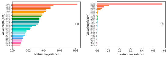 Feature bands selected by different algorithms. (a) GB; (b) AdaBoost; (c) RF; (d) CatBoost; (e) LightGBM and (f) XGBoost.