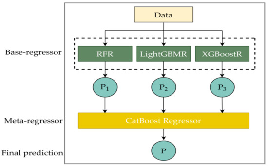 Six groups of Tibetan tea spectral features are selected using different feature extraction algorithms and used as inputs to the RFR, CatBoostR, LightGBMR and XGBoostR models. At the same time, based on the stacking combination strategy, RFR, LightGBM and XGBoostR are used as three base-learners, and CatBoostR is used as a meta-learner to build a new predictive model (Stacking model). The built Stacking model is shown in Figure 6.