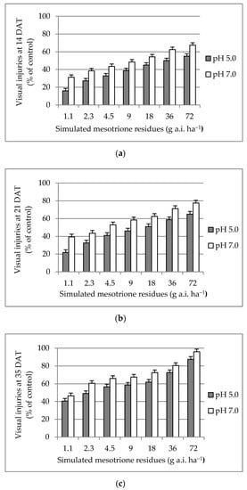 Visual injury (% of control) evaluation of pea at 14 (a), 21 (b) and 35 (c) days after treatment with simulated mesotrione residues applied to soil at pH 7.0 and pH 5.0. Vertical lines indicate a statistical difference according to Fisher’s LSD test at p ≤ 0.05.