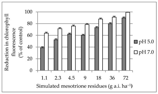 Chlorophyll fluorescence reduction (% of control) in pea plants 35 days after treatment with simulated mesotrione residues applied to soil at pH 7.0 and pH 5.0. Vertical lines indicate a statistical difference according to Fisher’s LSD test at p ≤ 0.05.