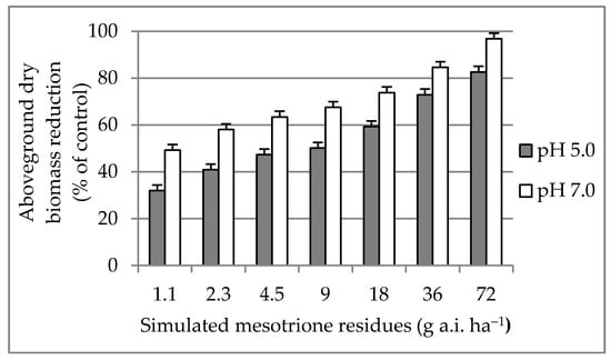 Reduction in aboveground dry biomass (% of control) of pea plants treated with simulated mesotrione residues applied to soil at pH 7.0 and pH 5.0. Vertical lines indicate a statistical difference according to Fisher’s LSD test at p ≤ 0.05.