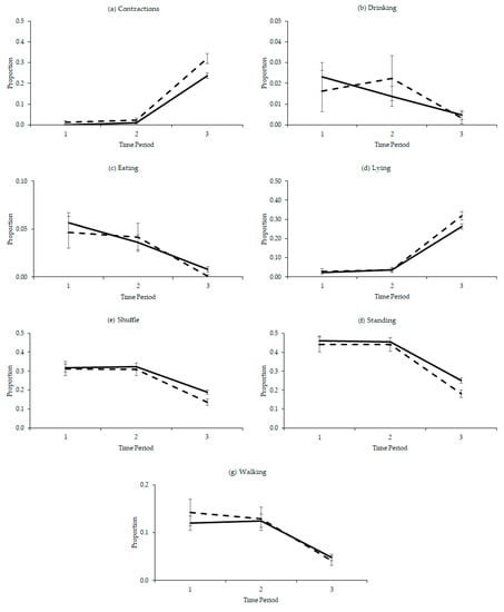 Predicted mean (± SEM) proportion of observations that were (a) contractions, (b) drinking, (c) eating, (d) lying, (e) shuffle, (f) standing and (g) walking behavior for assisted (dashed line) or unassisted (solid line) dairy cow calvings (n = 35) in time periods one to three, with period three ending with the birth.